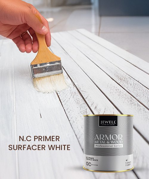 NC Primer Surfacer White is a fast‑drying nitrocellulose‑based primer surfacer designed to level and prepare interior wood and metal before NC or Melamine topcoats. The pigmented white primer combines nitrocellulose, alkyd resin and high‑quality pigments to give good hiding power, excellent adhesion on plywood, MDF, solid wood and metal, and very good grain filling.