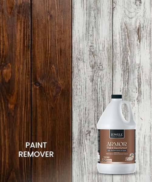Jewell Paint Remover (Extra Power), a powerful liquid stripper that removes paint, varnish, epoxy, urethane and lacquer from wood and metal surfaces. It penetrates the old film, causes swelling and loss of adhesion, so the softened coating can be scraped off easily with a spatula or scraper after 10–20 minutes dwell time.