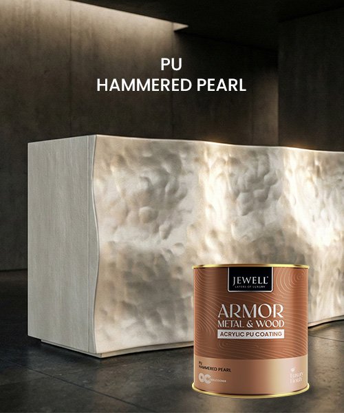 PU Hammered Pearl is a two-component acrylic special-effect topcoat that creates a hammered, pearl-metallic texture with subtle depth and movement on wood surfaces. Based on acrylic resin and selected pearlescent pigments, it delivers very good hardness and adhesion while providing a decorative, natural pearl-like hammered pattern influenced by the substrate colour.