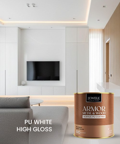 PU White High Gloss corresponds to Jewell Polyurethane White Hi-gloss, a two-component pigmented PU topcoat that delivers a brilliant, anti-scratch, high-gloss white finish for premium interior furniture. This superior-grade coating offers very good colour retention, flow and leveling, creating a smooth, glassy surface that enhances the look of wardrobes, doors, paneling and cabinetry.